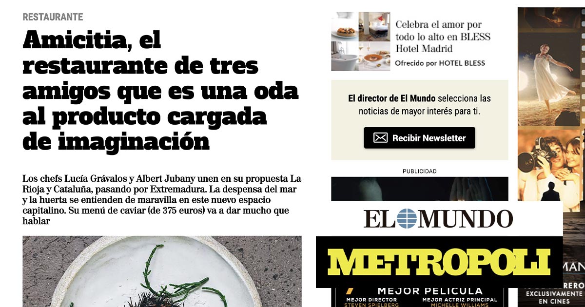 La suma puede superar el resultado matemático y convertirse en algo más grande en fondo y forma; así es Amicitia para El Mundo. El diario nacional aplaude la llegada de Amicitia a la capital como un restaurante que defiende el producto local.