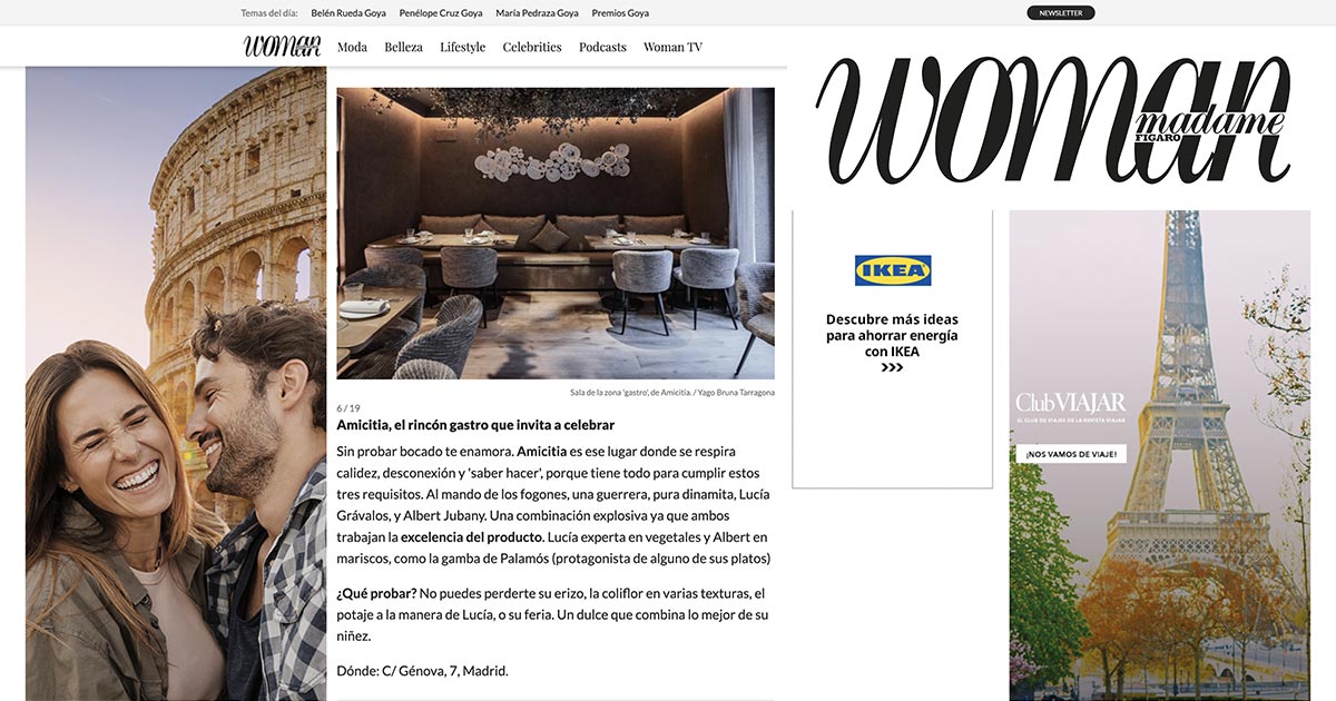 Calidez, desconexión y ‘saber hacer’ son los tres requisitos que cumple el restaurante Amicitia. Un rincón gastronómico que, según la revista Woman, invita a celebrar. Al mando de sus fogones, Lucía Grávalos, con un gran dominio de los vegetales, y Albert Jubany, experto en mariscos, trabajan la excelencia del producto en pleno centro de la capital.
