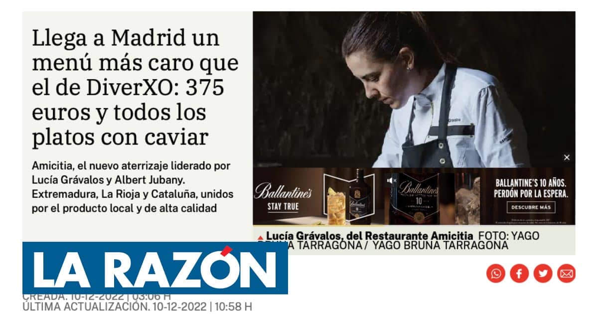 El diario nacional La Razón se adentra en las raíces, los orígenes, los platos y en el espacio de Amicitia para poner en valor una experiencia gastronómica única. A través del conocimiento, el criterio sobre los productos de alta calidad y las técnicas culinarias más sorprendentes, la cocina cosmopolita y saludable de Amicitia se posiciona como referente culinario en Madrid.